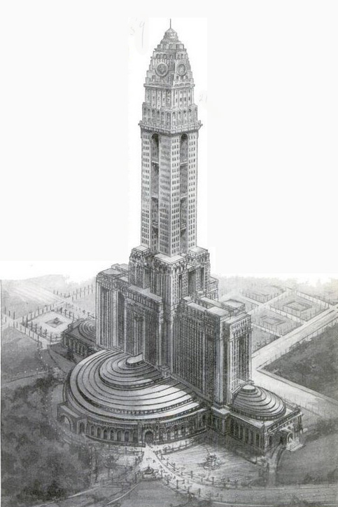 La prima versione dell’edifico, che risale al 1924-25, costituita da una torre centrale contornata da una serie di volumi voltati che inglobano grandi spazi pubblici, ben si rapporta ad una certa visione internazionale sul tema del “grattacielo” quale emergenza urbana eccezionale e, se certo non trova i motivi di una oggettiva coerenza strutturale in termini economici quale il modello americano poteva offrire, certo precede significativamente di parecchi anni il modello dei grattacieli della Mosca staliniana, al quale motivi di ordine simbolico, propagandistico e rappresentativo paiono di certo riferirlo.