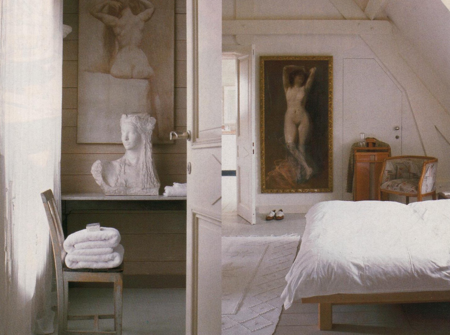 La padrona di casa scrive d’arredamento e di decorazione e il suo lavoro di ricerca la porta in giro per il mondo per lunghi periodi, e comunque la obbliga ad andare a Parigi due o tre giorni a settimana. «Passo la giornata a veder gente», racconta, «e sono costretta, se così si può dire, a un’intensissima vita mondana! Quindi nei momenti liberi devo essere capace di staccare completamente la spina per ricaricarmi con i miei affetti. Per questo con Eric, che è antiquario di professione e stanziale per vocazione, abbiamo deciso di far base in campagna, qui vicino a Bruxelles, che è la nostra città d’origine e dove abbiamo tutti i nostri più cari amici». La casa, un’antica fattoria di mattoni rossi tipicamente nordica, che si sviluppa attorno a una corte quadrata, sembra il modello ideale per vivere tutti felici e contenti. L’antico granaio è diventato il regno del padrone di casa, studio e biblioteca per raccogliere oggetti d’arte e gli amati volumi; un altro corpo raduna le camere degli ospiti, e in mezzo c’è la casa vera e propria, cuore dell’arte del ricevere e quintessenza delle delizie campestri: un immenso camino nel quale bruciare tronchi lunghi un metro, divani dove sprofondarsi in interminabili conversazioni, la cucina, il tavolone da pranzo. A immagine dei padroni di casa, l’architetto Erik Véne ha realizzato un arredamento raffinato e prezioso, fatto di legni chiari d’ispirazione gustaviana, che esaltano gli spazi ampi e luminosi.