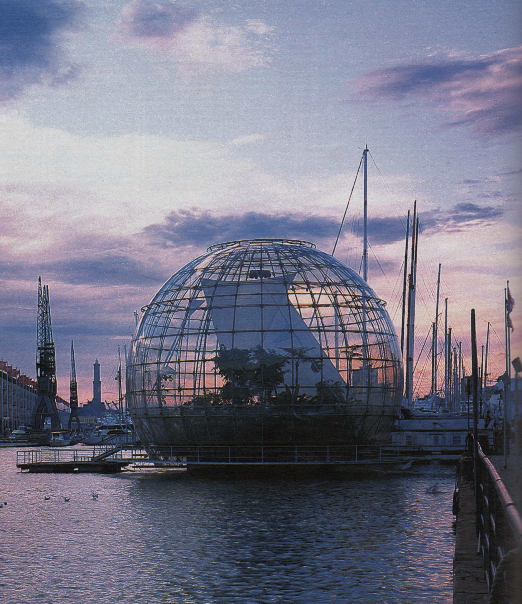 Nella foto, la Biosfera, “bolla” tecnologica, progettata da Renzo Piano nel Porto Antico, accanto all’Acquario: un angolo di foresta amazzonica animata da farfalle, iguane e rare felci arboree.