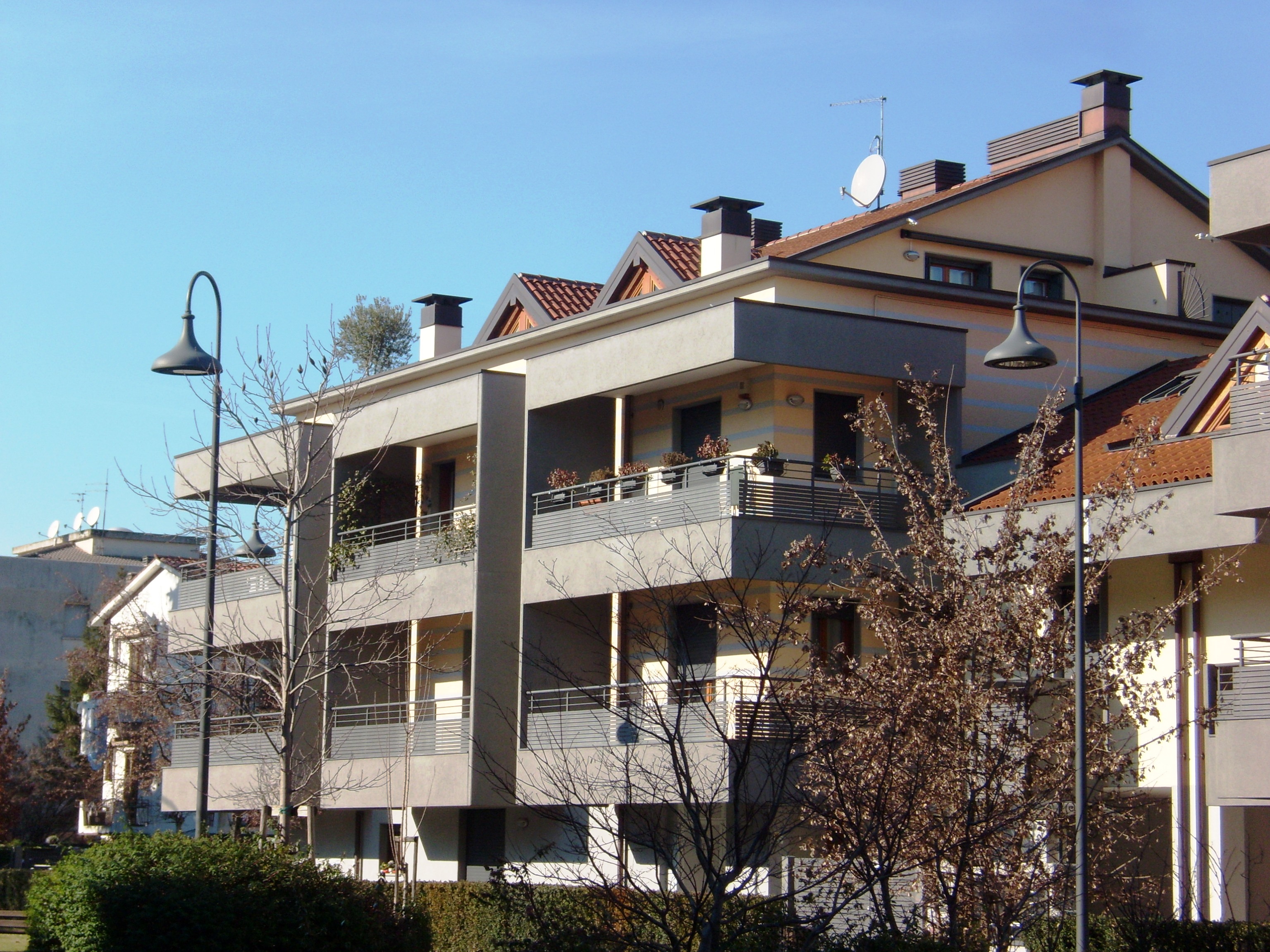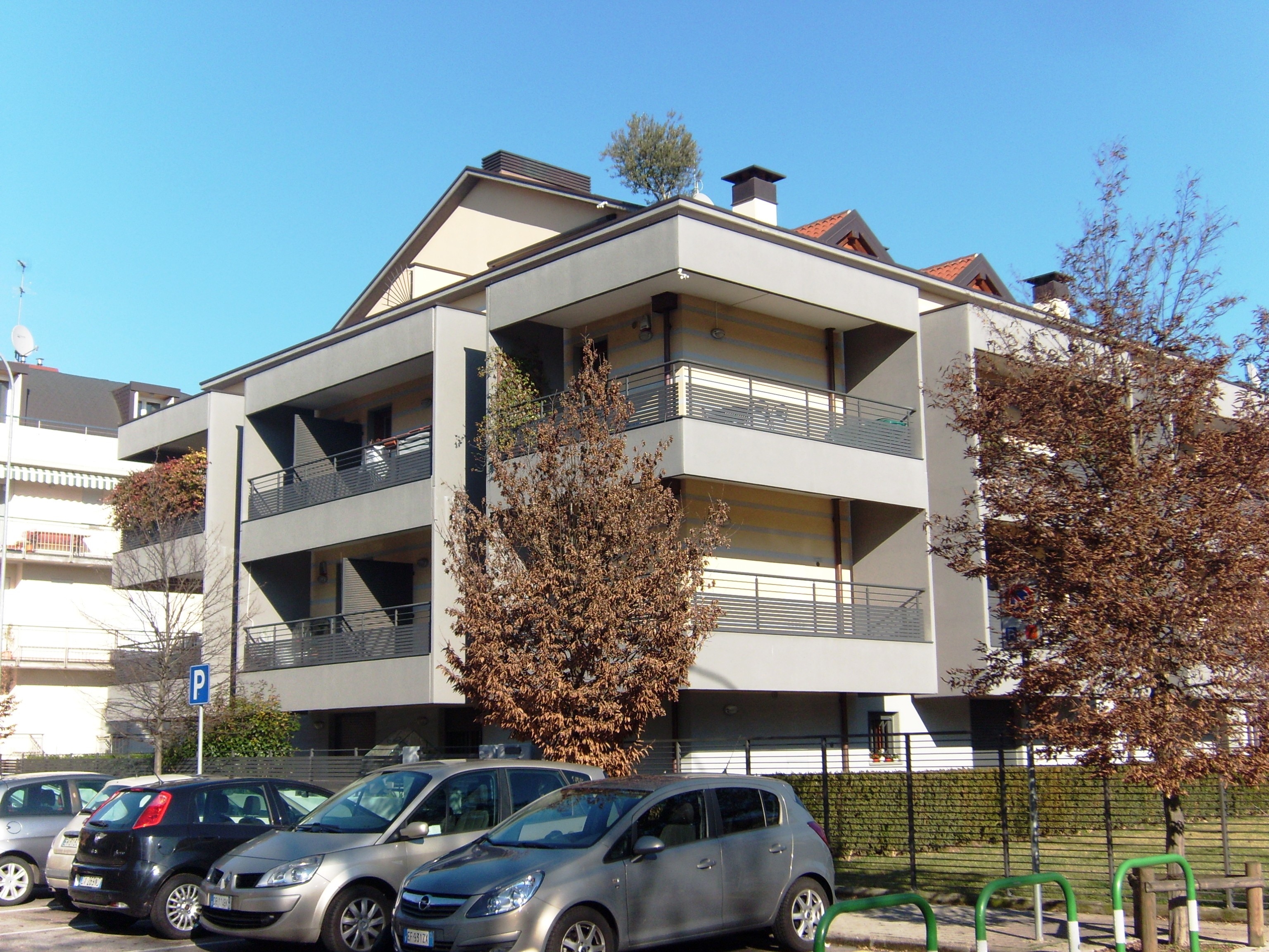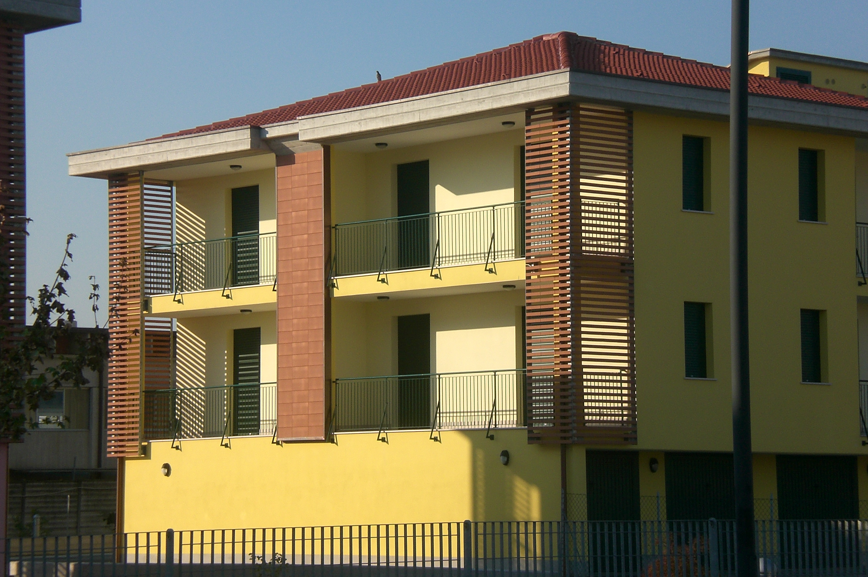 Gli edifici sono di impostazione e volumetria simili, si è cercato di dare una definizione e specificità particolare agli accessi dei due vani scala, i quali sono stati accorpati in un unico ingresso che riunisce i due vani scala stessi in un atrio comune, che diventa il luogo di incontro sia per chi giunge dagli ingressi pedonali esterni che per chi arriva dai garages posteriori.