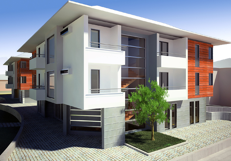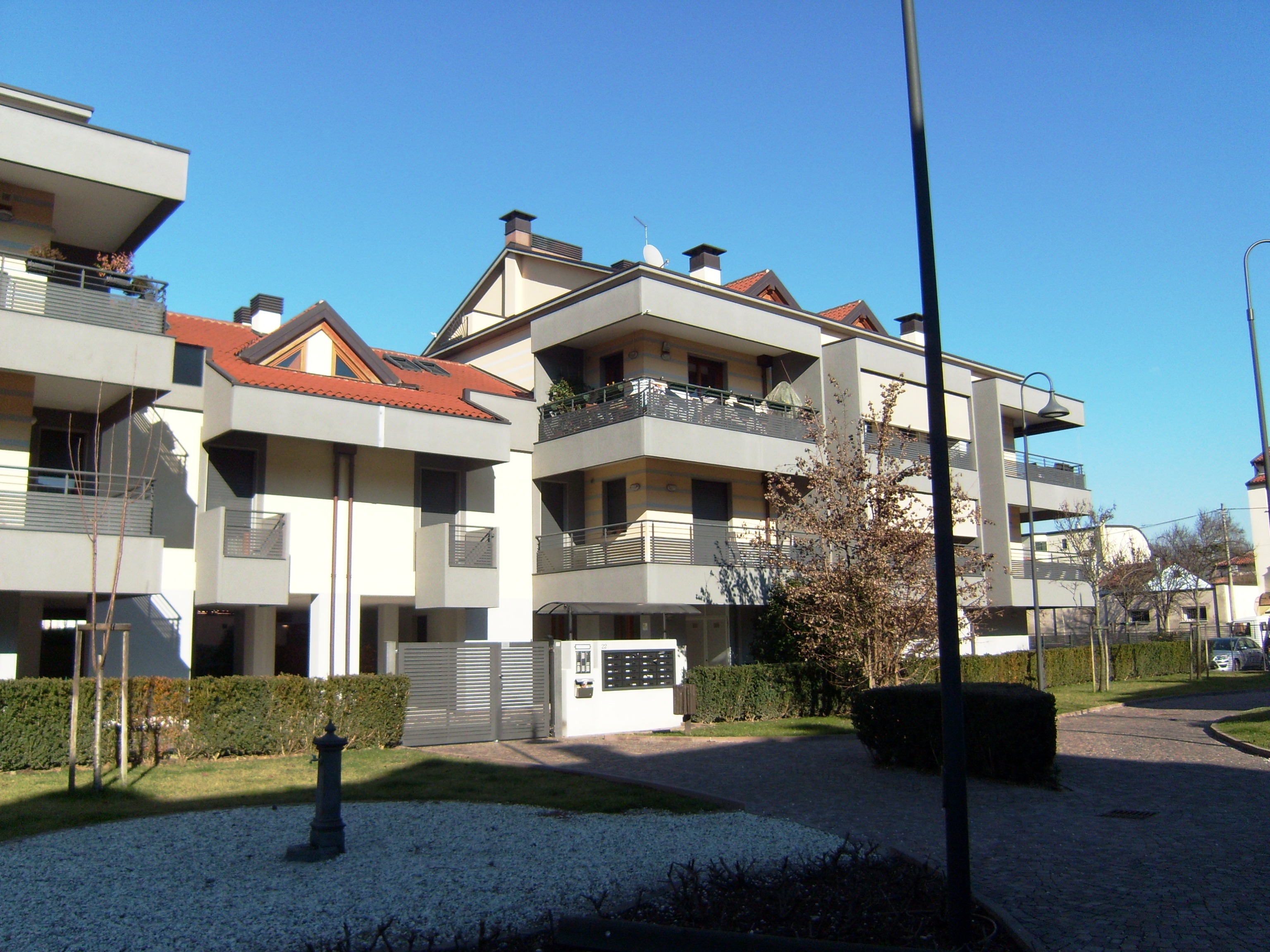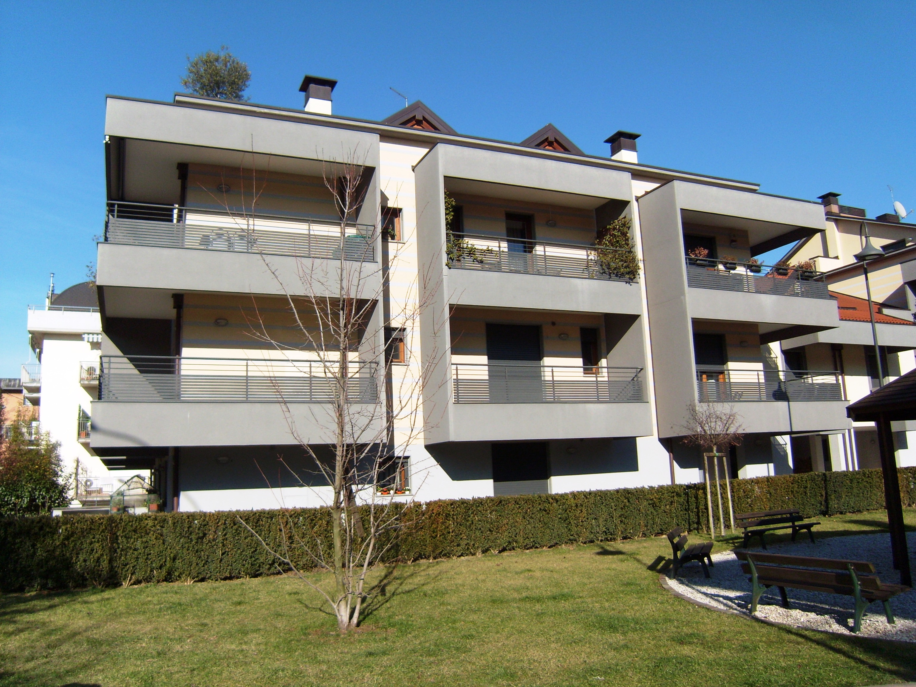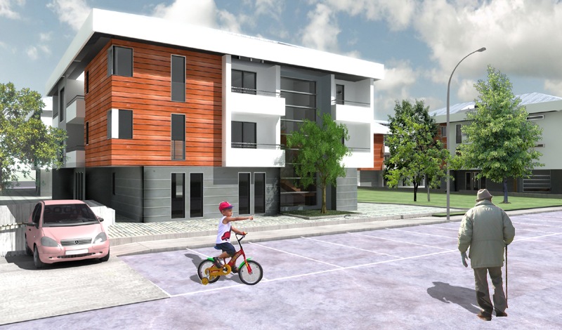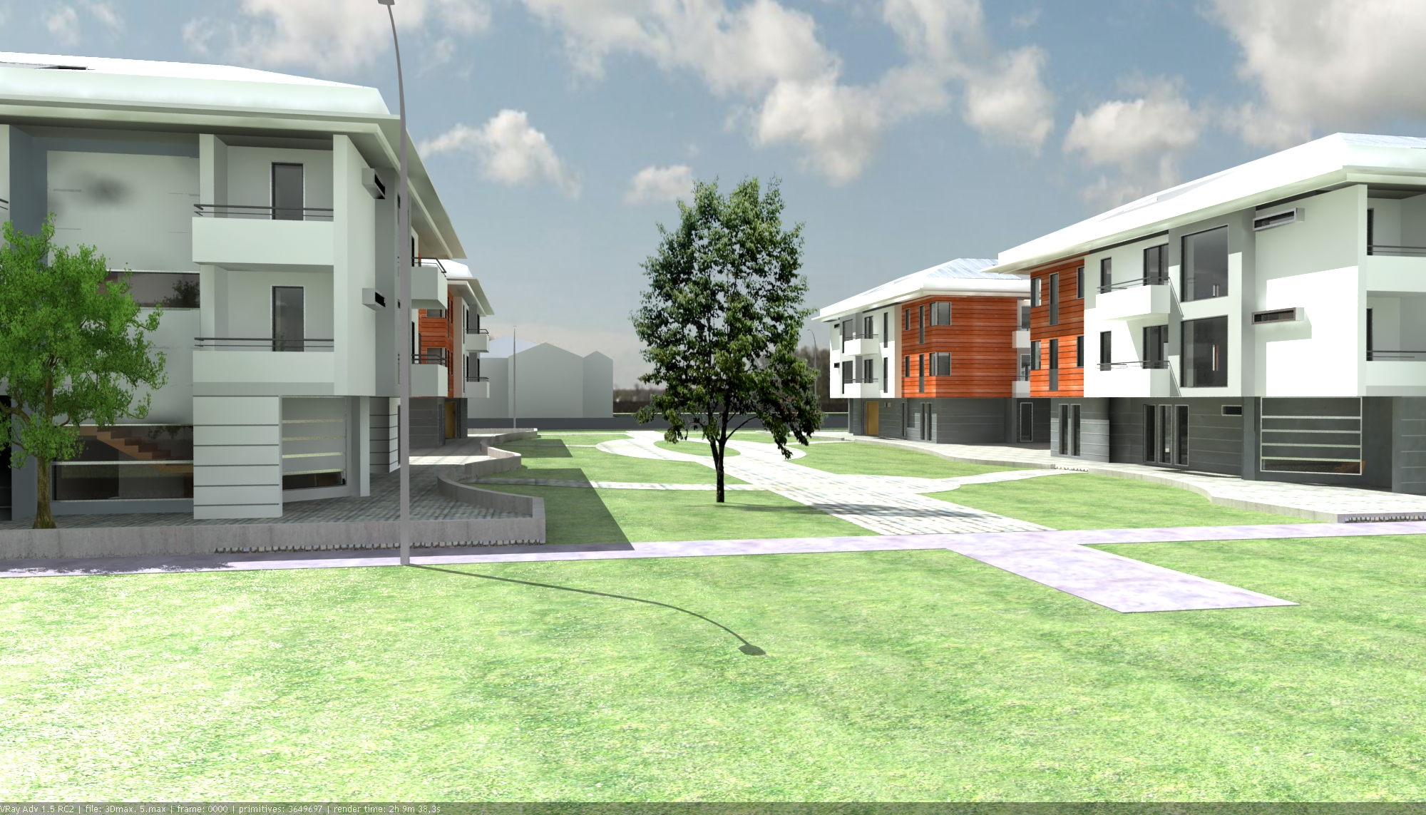 Gli edifici sono di impostazione e volumetria simili, si è cercato di dare una definizione e specificità particolare agli accessi dei due vani scala, i quali sono stati accorpati in un unico ingresso che riunisce i due vani scala stessi in un atrio comune, che diventa il luogo di incontro sia per chi giunge dagli ingressi pedonali esterni che per chi arriva dai garages posteriori.