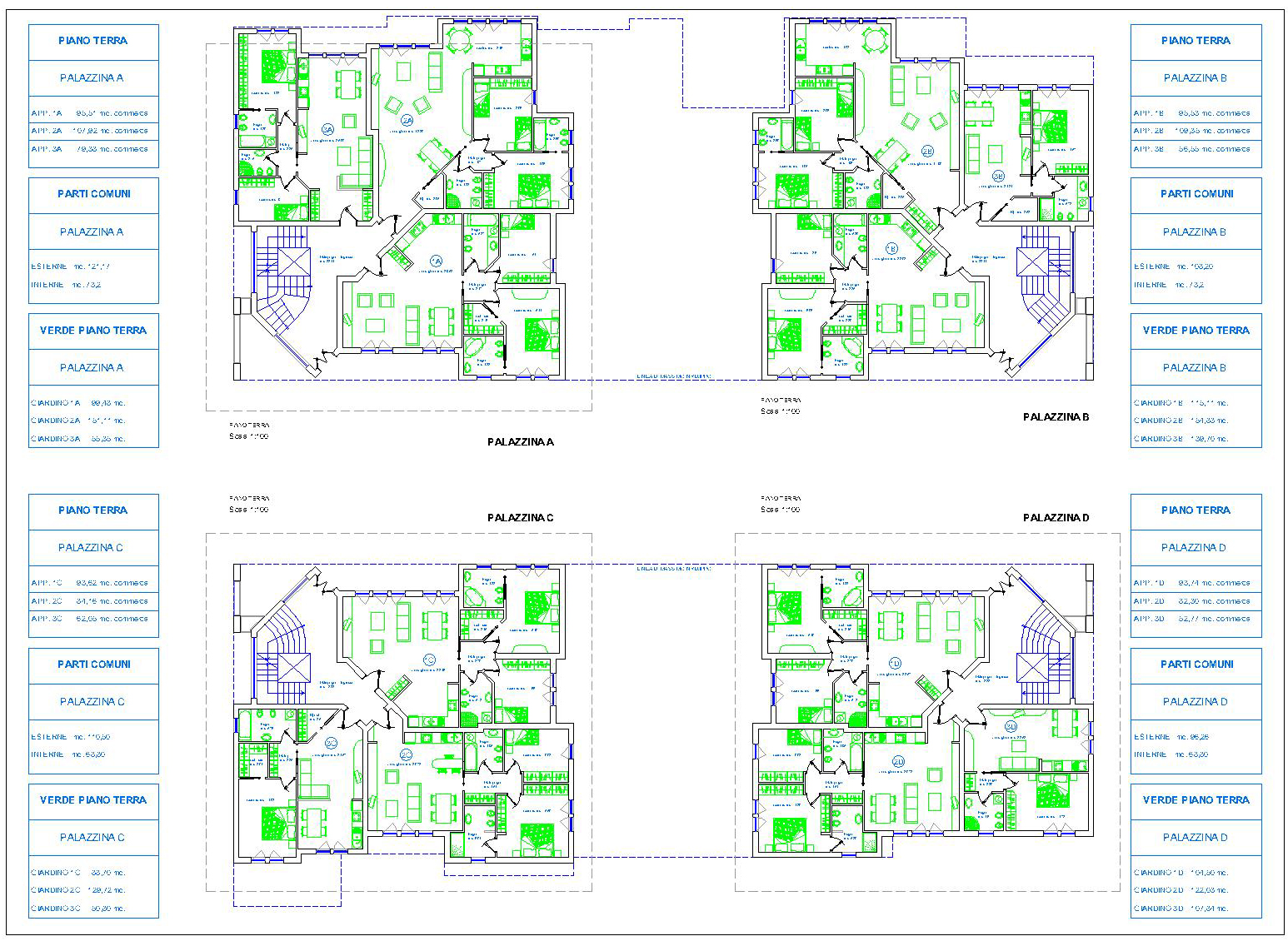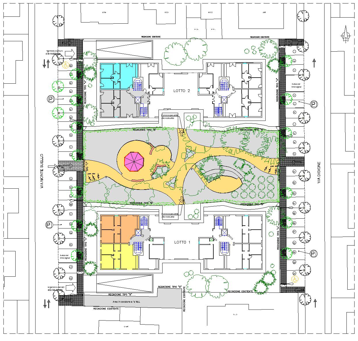 L’area su cui insistono è adibita parte a verde pubblico e parte a verde privato: la superficie a verde privato, interna all’area, viene organizzata a parco giochi per esclusivo uso interno, privilegiando così l’utente nella fruizione della corte che consegue allo spostamento verso la parte posteriore dei parcheggi, proponendo l’utilizzo della maggiore superficie a verde che ne risulta ad uso dei bambini che ottengono uno spazio esclusivo, sicuro e protetto, all’interno dell’area cintata di proprietà e controllati “a vista” dai genitori.