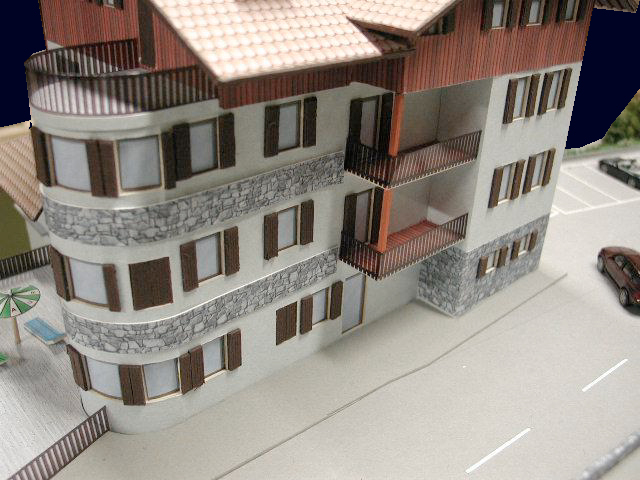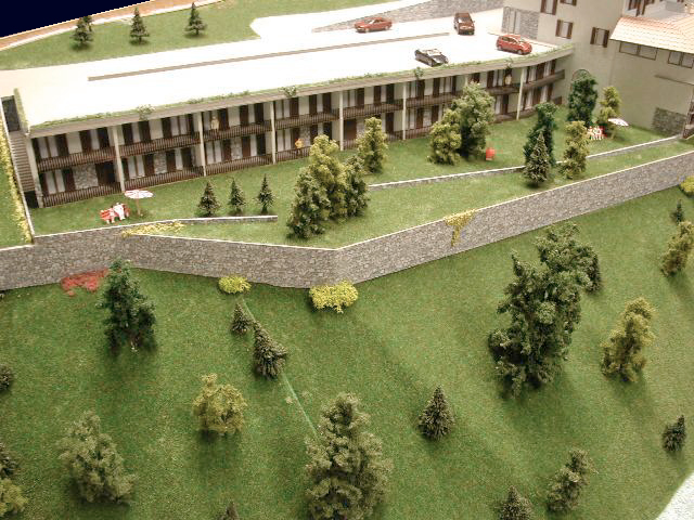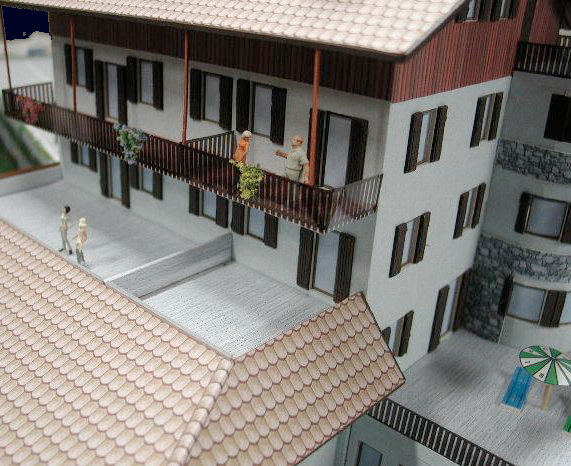 La parte invece di nuova realizzazione verrà destinata unicamente ad appartamenti di circa 42 mq., di cui otto al piano scantinato e otto al piano seminterrato; in questo modo, essendo i due livelli posti sotto al piano stradale, non hanno alcun impatto visivo per chi arriva e perciò non vanno a disturbare la vista del Lago di Sauris. Questa scelta è stata fatta proprio per limitare al minimo l’impatto ambientale e per avere una maggiore integrazione con il paesaggio e la struttura esistente. Inoltre, per amalgamare il “vecchio” al “nuovo”, sono stati utilizzati materiali tipici del luogo, come il legno, la pietra e riproposti elementi essenziali dell’involucro esterno dello stavolo, come i terrazzi graticciati, le scale esterne in legno, i comignoli rivestiti in legno, gli abbaini di forma tradizionale, il manto di copertura in scandole di legno originali.