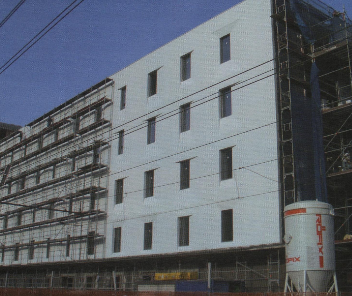 Questa tecnica permette innanzitutto di evitare la demolizione del vano finestra quando il controtelaio esistente non risulta utilizzabile e, soprattutto, consente di impostare il nuovo serramento a contatto diretto con il cappotto, eliminando così anche il potenziale ponte termico che si creerebbe agli intradossi dell’apertura. In questo modo le murature svolgono la duplice funzione statica e di volano termico, in virtù della massa dei materiali che le compongono e della loro inerzia rispetto alle fluttuazioni della temperatura. A tale scopo, anche i divisori interni sono stati realizzati con laterizi forati in luogo delle più flessibili, ma meno performanti anche in termini di isolamento acustico, pareti leggere in lastre di cartongesso impostate sopra i sottofondi. L’approccio mininvasivo che ha caratterizzato la ristrutturazione dei livelli inferiori ha interessato anche le facciate esistenti, mantenute pressoché intatte conservando il rivestimento in intonaco graffiato che, per effetto della ruvidità della superficie, si prestava a facilitare la presa dei collanti che avrebbero poi sostenuto i blocchi di polistirolo espanso elastificato – Eps-E, un prodotto garantito per quanto riguarda la stabilità dimensionale a seguito dell’esposizione alle condizioni atmosferiche, contenente anche polvere di grafite che riduce le proprietà di trasmissione del calore – che compongono il cappotto. Il cappotto è presente anche sul tetto piano, con uno spessore di soli 28 cm di Eps dalle caratteristiche differenti rispetto a quello impiegato in facciata, cioè non elastico ma con maggiori prestazioni meccaniche per resistere al peso dello strato di terriccio misto a ghiaia che forma il suolo del giardino pensile posto in copertura. Il tetto verde è stato realizzato senza particolari sistemi o prodotti specifici: è composto da un’ampia area estensiva e da aiuole rettangolari per la coltivazione intensiva – e perciò irrigata – dei vegetali. La posizione dell’edificio, che sorge in prossimità della prima banchina della stazione ferroviaria di Bolzano, ha reso necessario installare il cantiere occupando parte del parcheggio antistante l’edificio. La ridotta superficie a disposizione non ha comunque condizionato l’esecuzione delle opere, la cui complessità era decisamente contenuta, completate nell’arco di circa 20 mesi. Le demolizioni in quota del sopralzo esistente e degli interni sono state eseguite tutte a mano, essenzialmente per motivi di sicurezza, utilizzando per lo scarico delle macerie l’unica gru centrale, poi utilizzata durante la prima fase dei lavori, fino a ottobre 2005.