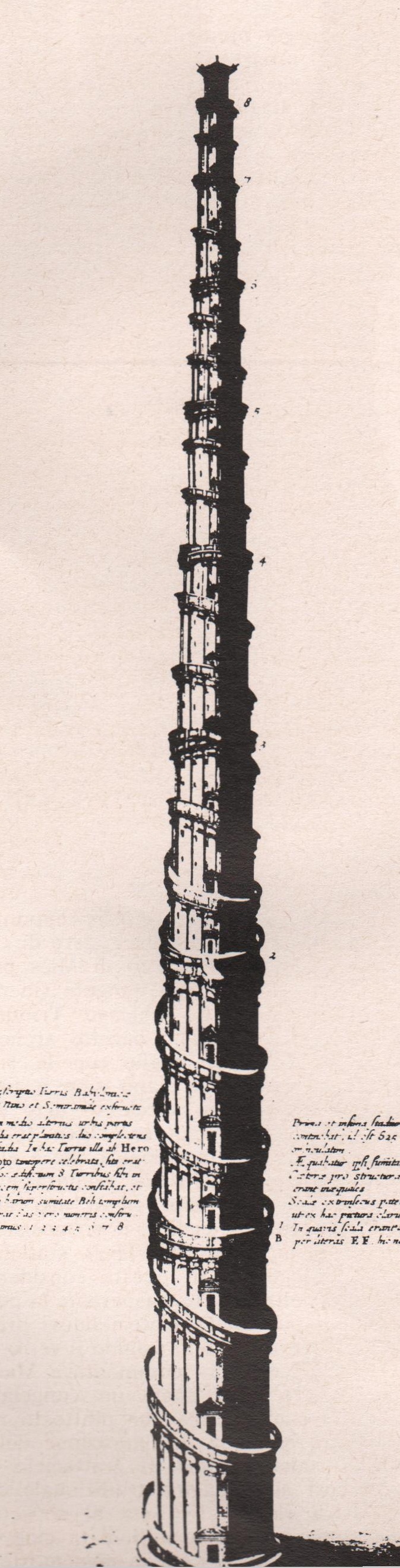 La demolizione del mito babelico da parte dell’imperturbabile gesuita si fondava del resto su una specifica prova di gravità e di perdita d’equilibrio per il peso proprio (ricordiamo tutti il suo paradossale, splendido disegno ariostesco “di prova”) e su altre due semplicissime constatazioni, una di mancanza di tempo (se per i 3.426 anni indicati nei testi avessero lavorato di continuo 4 milioni di uomini e la torre fosse progredita in altezza di un giro di un miglio alla settimana, la torre in tale tempo non avrebbe potuto esser finita) ed una di mancanza di materie prime (se tutti i materiali necessari fossero stati trasportati sul luogo, né sarebbero bastati i legni per far cuocere i mattoni, né ci sarebbe stata sufficiente argilla o acqua per soddisfare alle esigenze del cantiere).