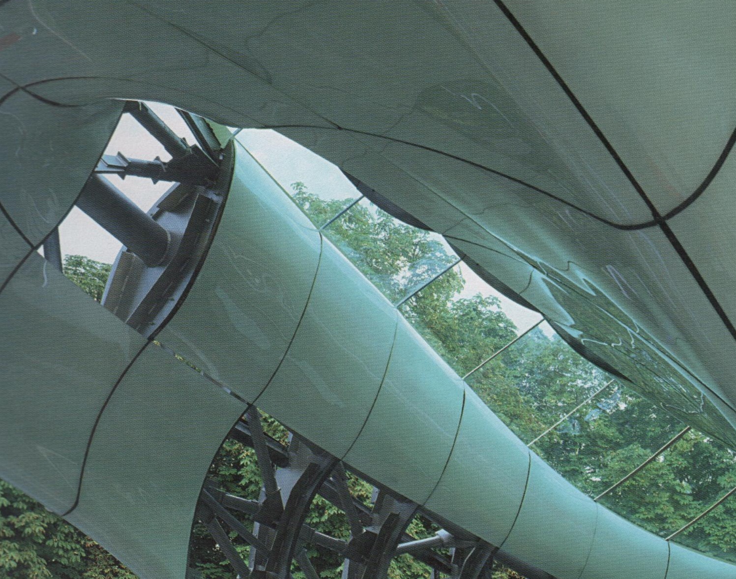 L’unione tra la copertura costituita dalle lastre di vetro e lo scheletro portante di lastre d’acciaio ha comportato lunghi studi di progettazione e la partecipazione di vari esperti nel settore. La difficoltà principale è stata quella di reperire un elemento di giunto che fosse in grado di mutare ogni volta che il raggio di curvatura del vetro assumeva un nuovo valore, questo per poter esser allo stesso tempo interfaccia per il vetro e per la struttura metallica. Inoltre l’elemento doveva avere produzione standardizzabile. La soluzione ritenuta valida è stata quella di saldare dei profili, con sezione a «C», di polyethylene (Pe), al vetro e, attraverso a un semplice sistema di avvitatura, legare questi pannelli alla struttura portante delle lastre in acciaio. Il materiale scelto offre la flessibilità necessaria per seguire i vari cambi di raggio di curvatura e insieme nasconde al proprio interno la standardizzazione della produzione: un unico profilo lineare, tagliato e deformato su misura per ogni singola lastra, funge da interfaccia tra i due materiali.