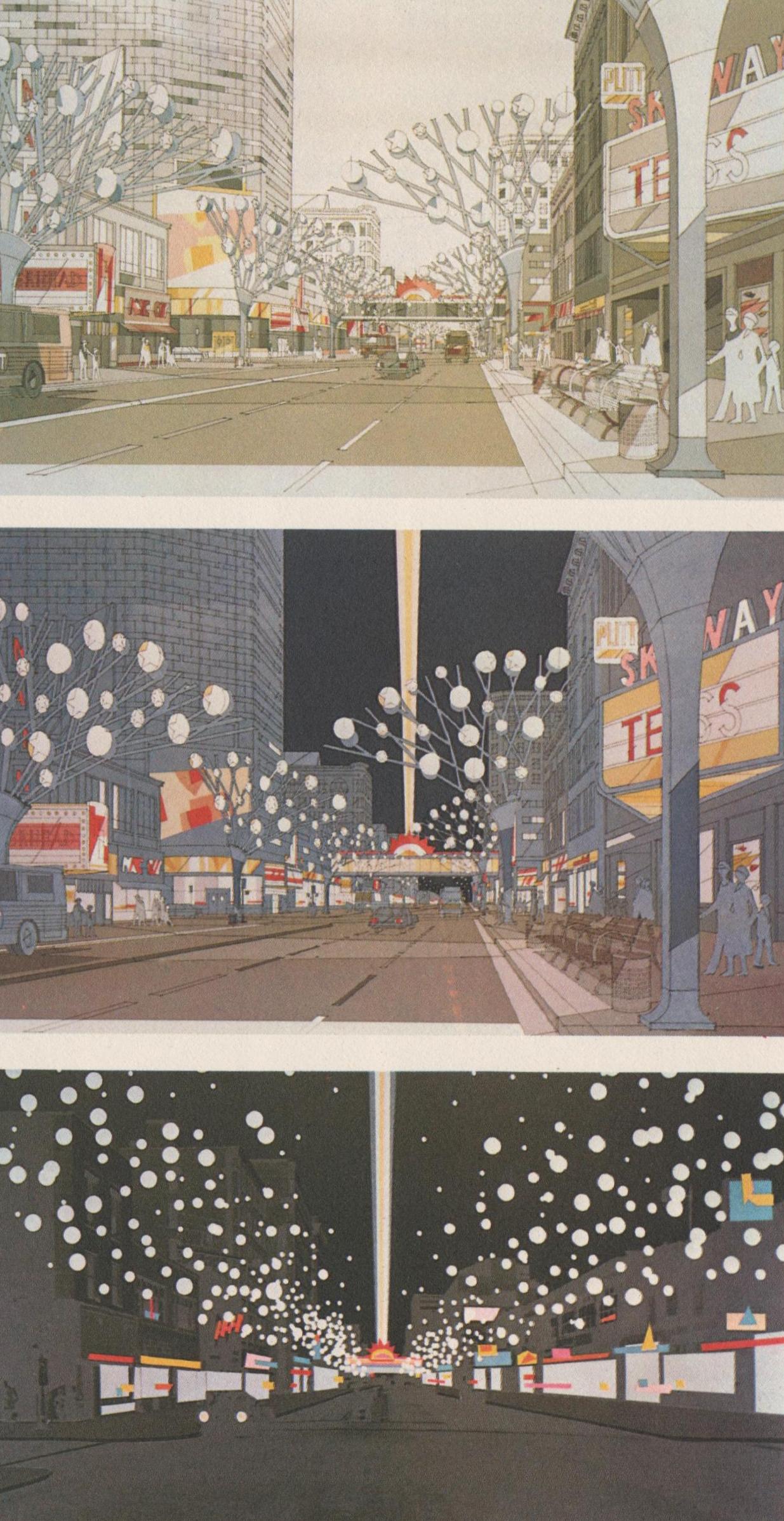 Ciò che si può desumere da questa prima ricognizione del tema è il fatto che l’uso architettonico dell’illuminazione artificiale prefigurato dalle avanguardie e sfruttato senza risparmio dal linguaggio commerciale della città capitalista, da almeno cinquantanni sta sempre più frequentemente entrando nella pratica progettuale dello spazio urbano, almeno all’interno delle culture tecnologicamente più avanzate. A questo proposito, anche a seguito della disponibilità di nuove tecnologie della fonte luminosa (ad esempio il laser), possono già essere intraviste le prime configurazioni tipiche della costruzione dello spazio attraverso l’uso dell’illuminazione