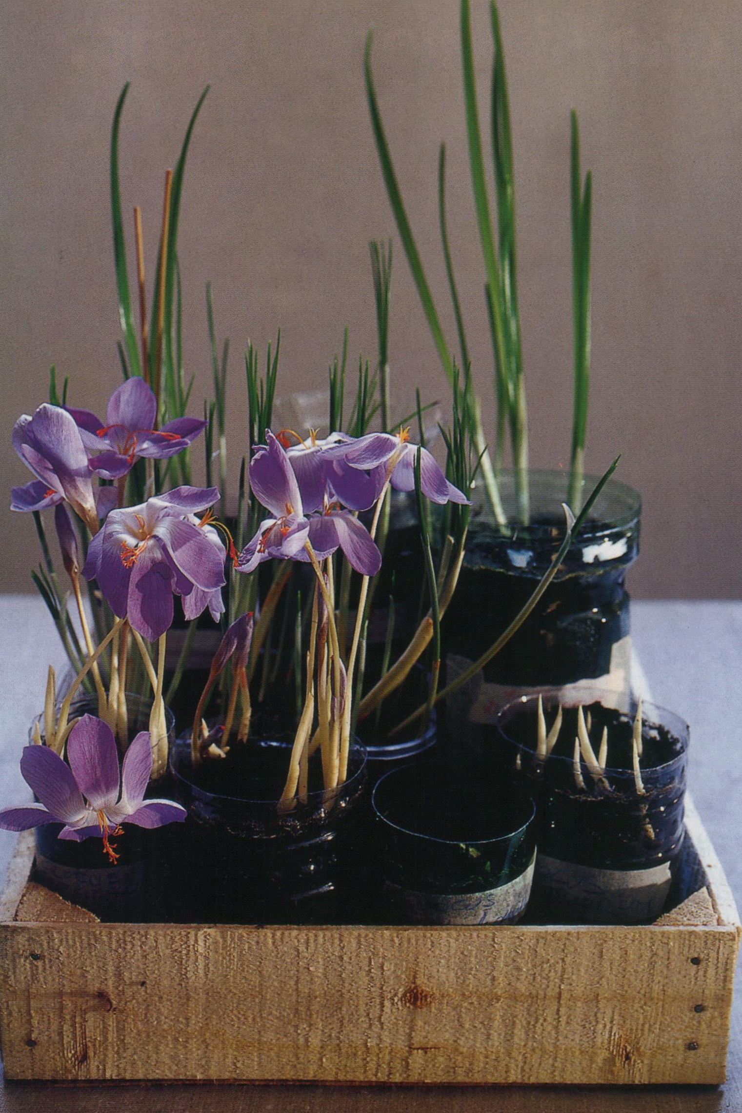 Nella foto, cresciuti in bottiglie di plastica tagliate a metà e forate, i profumati giacinti e i ciuffi verdi dei narcisi creano composizioni raffinate dall’aria casuale. La semplice cassettina da lavoro in legno è perfetta per gli attrezzi da giardiniere necessari a curare i bulbi. Quasi tutte le varietà di tulipano, oltre 5.000, possono fiorire in contenitori da tenere in casa: quelle medio-piccole sono più indicate allo scopo.