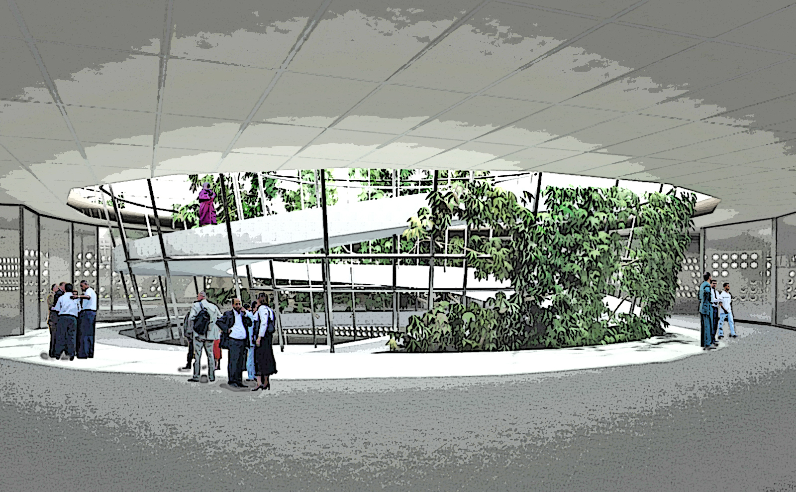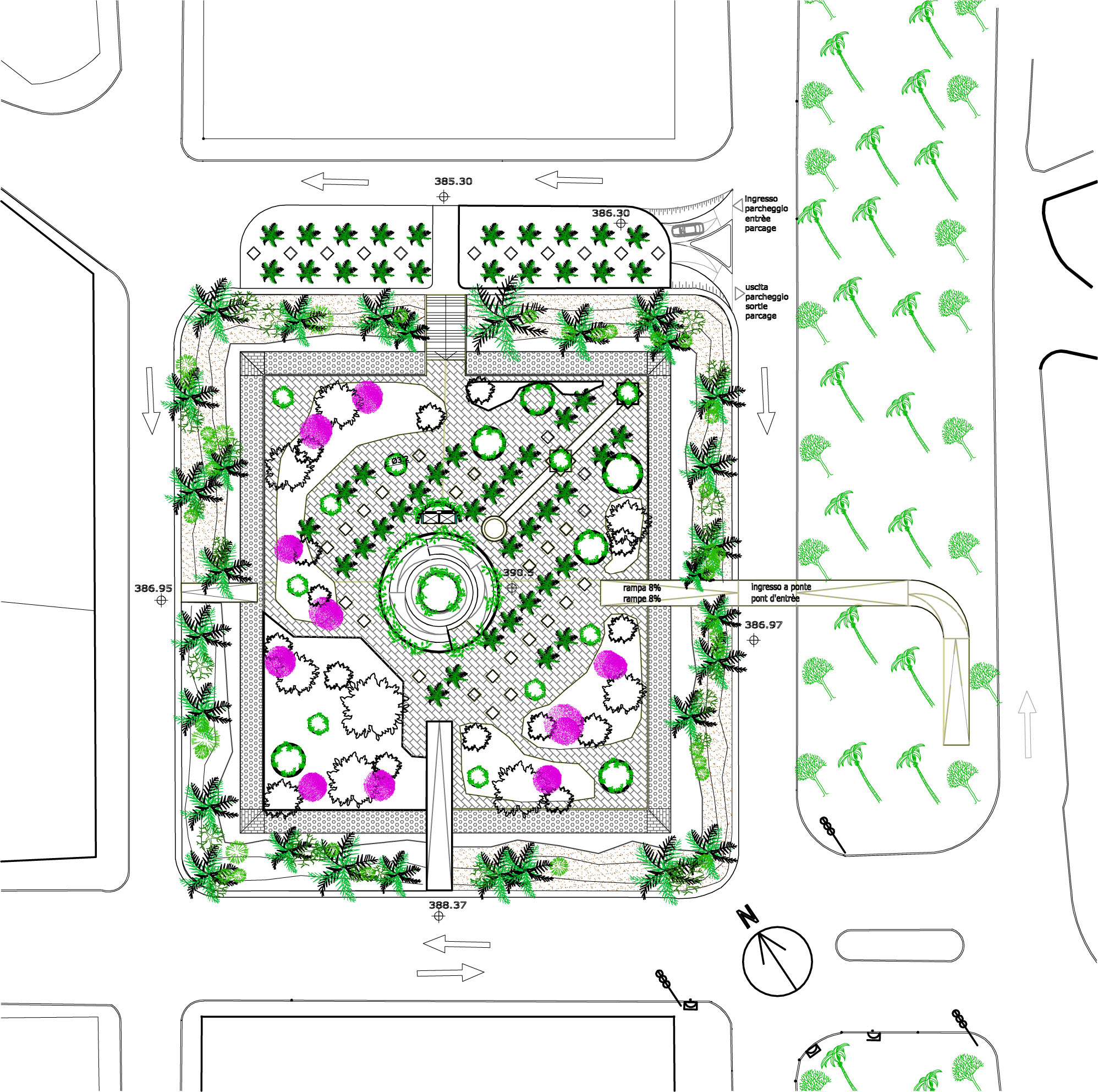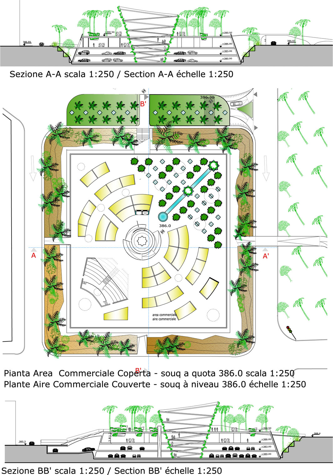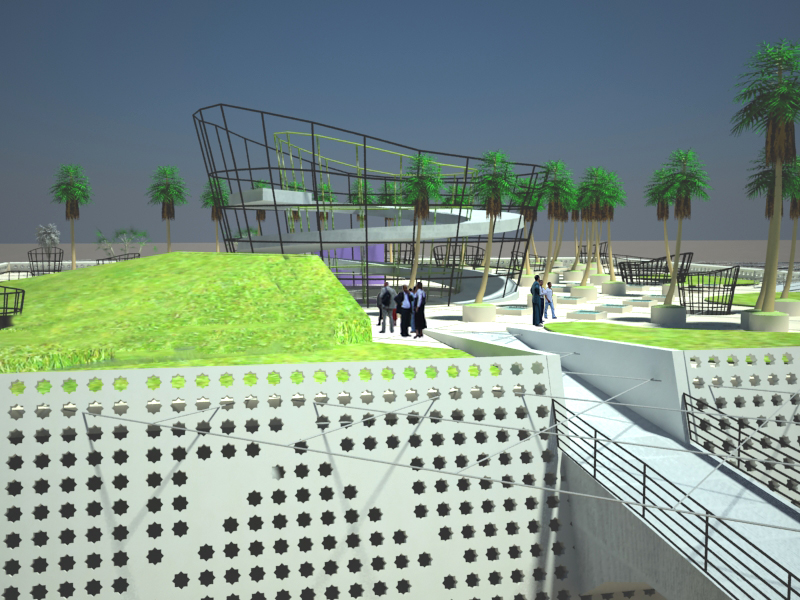Caratteristica dell’oasi, con la presenza dell’acqua, è il verde, i palmeti con la loro ombra, le zone di sosta e riposo: si è così pensato di articolare la piazza esterna, con varie zone ben definite di prato e piccole collinette che degradano dolcemente, con panchine nelle aree intorno alle aperture a pergola. Queste zone “naturali” abbracciano ai quattro lati l’asse principale verso est, dove si è invece costruito, per contrapporlo gerarchicamente, un giardino ordinato e simmetrico. Abbiamo inserito lo stesso giardino al livello del piano commerciale: così anche nell’area commerciale coperta-souq c’è un richiamo al verde e all’oasi.