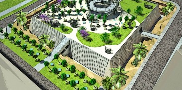 Ecco allora che si è voluto riproporre simbolicamente questo luogo, l’oasi, con un intervento di sottrazione che ha permesso di far emergere da un pendio di dune sabbiose una piazza/edificio, uno spazio nuovo che si propone con ruoli molteplici rispetto al precedente, perché è piazza, è giardino, è viale di palme con vari punti di sosta, è luogo di meditazione, di passaggio ma anche centro di affari.