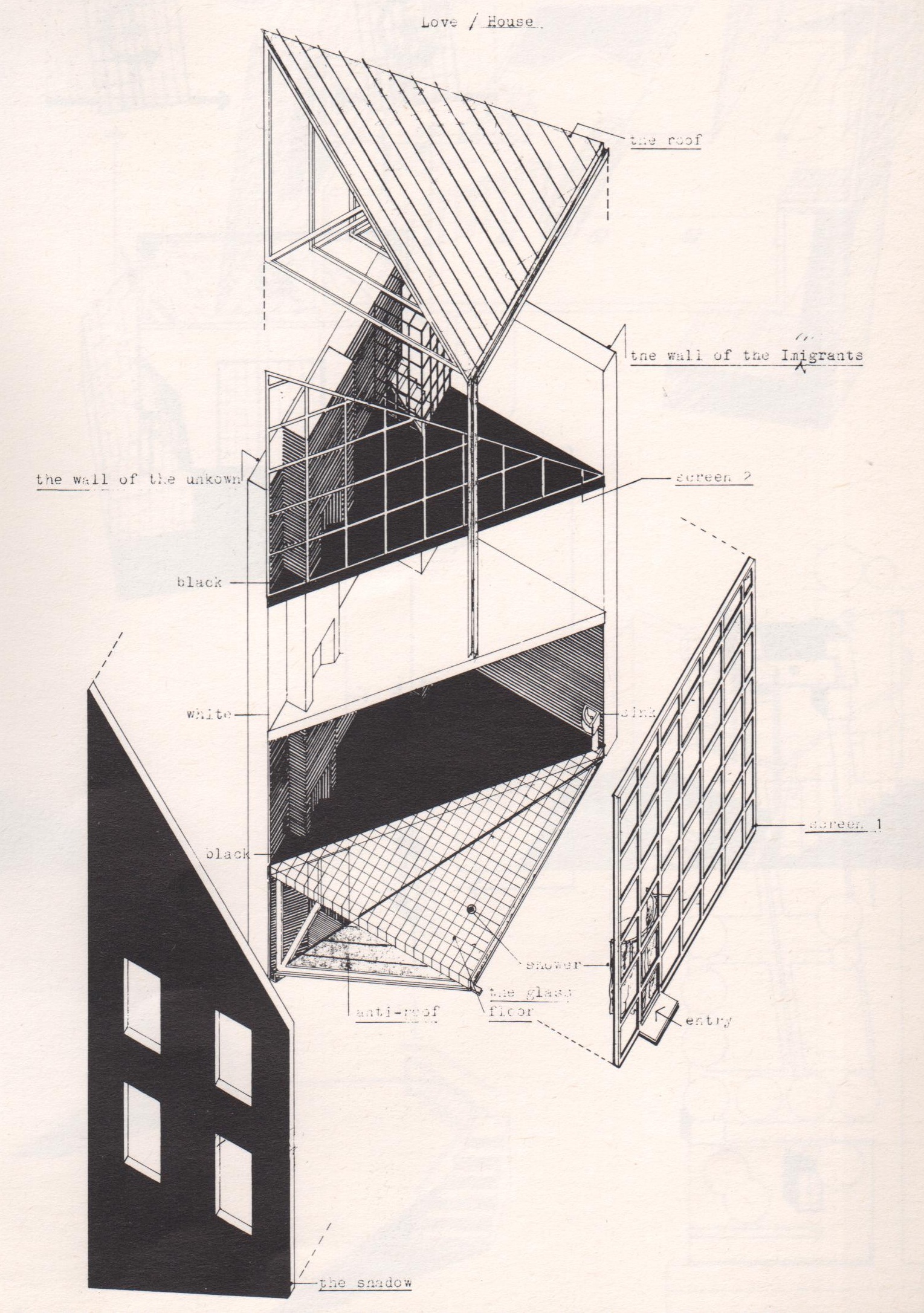 Non diversamente dalla dimensione inconscia, la bianco-nero- verde casa ombra si erge come un’altra realtà contrapposta alla convenzionale dimora unifamiliare. Quest’altra realtà è l’architettura, qui diventata puro sogno e disegno, ma tutt’ora contrapposto elemento alle convenzioni della pianta e allo stesso amante.
