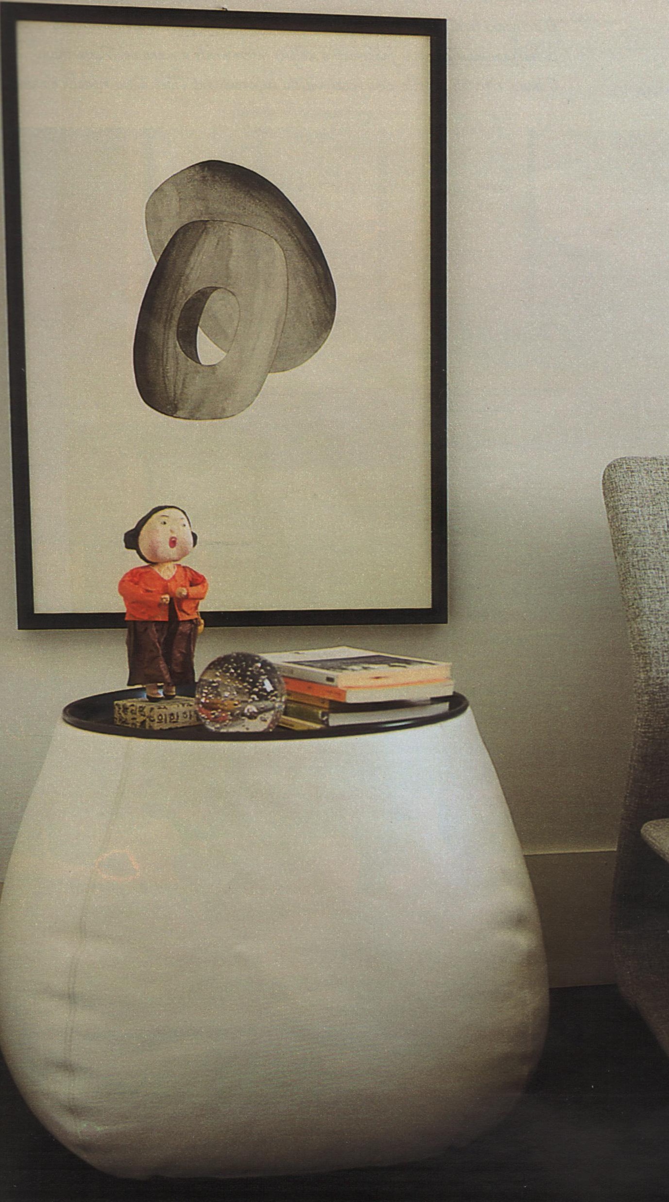 A casa sua, su due carrelli di plastica nera progettati negli Anni 70 da Joe Colombo, le lampade di modernariato acquistate in un mercatino di Miami si affiancano a libri, modellini di studio e altri oggetti d’uso quotidiano. La stampa a parete (come anche quella in camera da letto) è opera di Muniz.