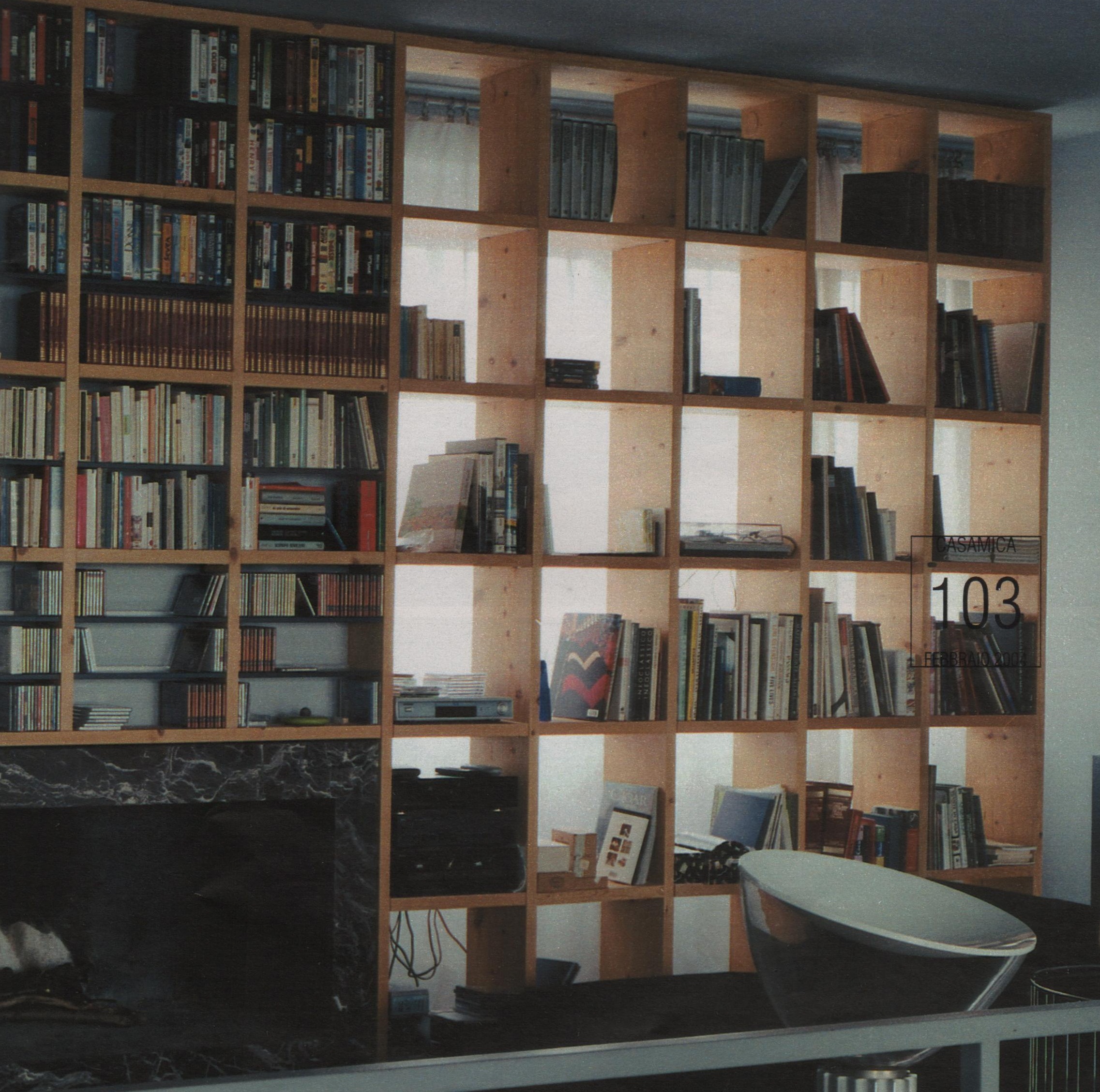 Al piano superiore, nella parte sinistra del ballatoio che porta alla zona notte, è stato ricavato uno studio schermando due finestroni che avevano un panorama poco interessante e sistemando davanti una grande libreria fatta su misura, che ingloba anche il camino. L’angolo conversazione è formato da una coppia di chaise-longue Hockney disegnate da Rodolfo Dordoni per Minotti, e dalla Coconut Chair di George Nelson prodotta da Herman Miller. La lampada e la Taccia, un classico di Achille e Pier Giacomo Castiglioni per Flos.