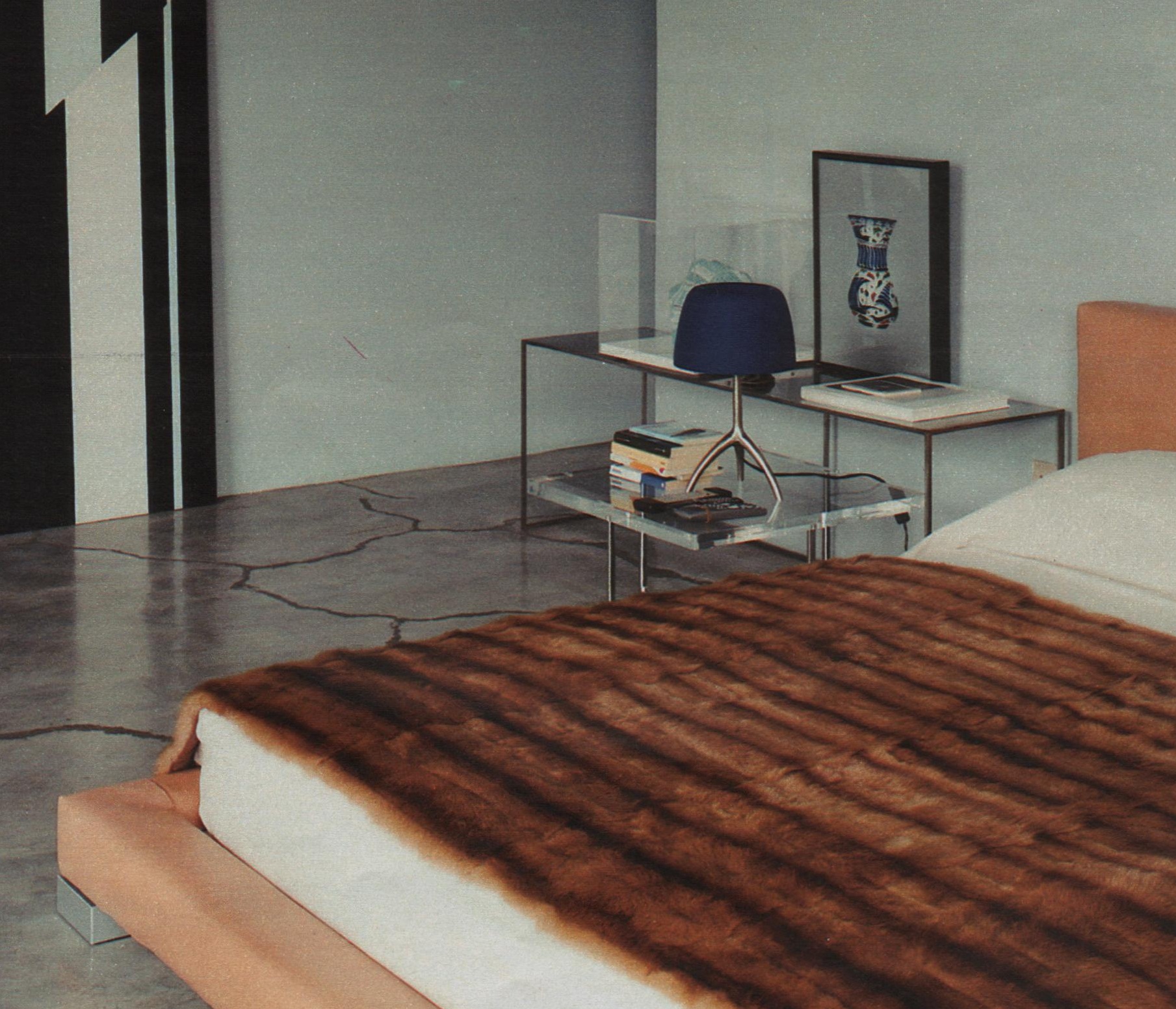 Ancora un’immagine del soggiorno di Rodolfo Dordoni, un ambiente fluido, non di rappresentanza, con opere d’arte informalmente appoggiate al pavimento e pochi scelti pezzi di un modernariato: come la curiosa Wiggle Side Chair, In cartone, di Frank Gehry (Vrtra) e classici come la lampada Toio di Achille e Pier Giacomo Castiglioni per Flos, o i vetri di Ettore Sottsass. Poltrona con poggiapiedi “Blake” di Dordoni.